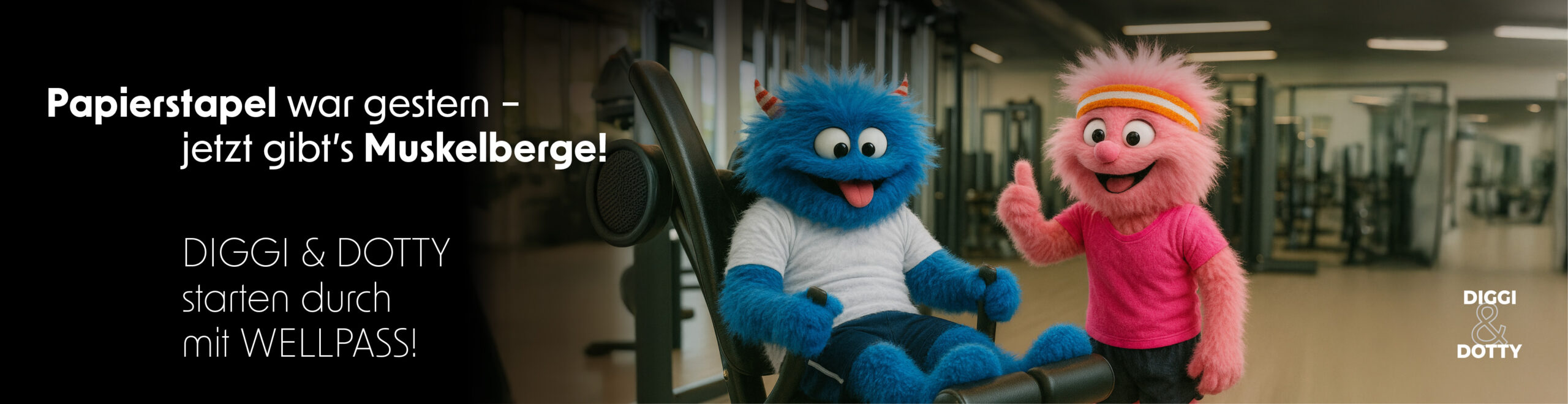 „Puh… nach dem dritten Aktenordner war DIGGI eigentlich schon im Warm-up-Modus.Aber Dotty hatte da eine bessere Idee: Warum nicht mal richtige Fitness?“ …